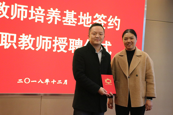 双方代表在合作共建协议上签字并交换协议书。施盛威为学院首家青年教师培养基地授牌。