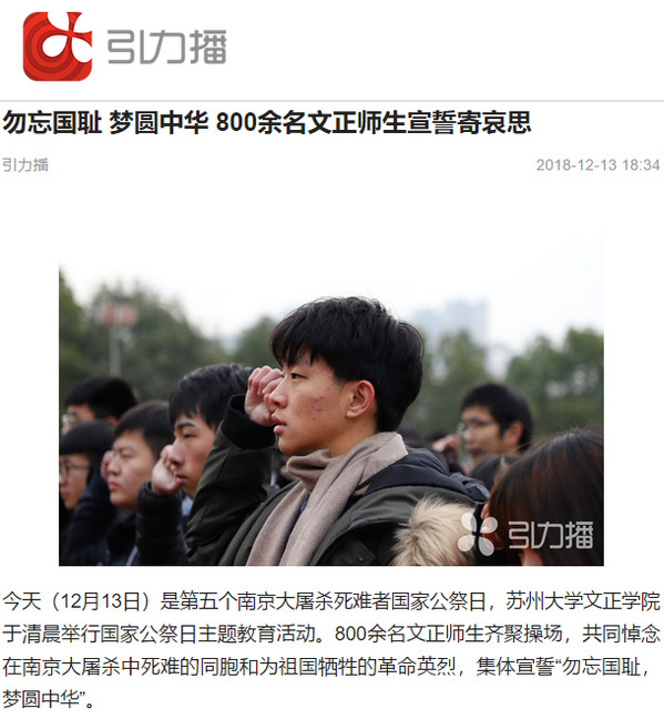 今天(12月13日)是第五个南京大屠杀死难者国家公祭日,苏州大学文正学院于清晨举行国家公祭日主题教育活动。800余名文正师生齐聚操场,共同悼念在南京大屠杀中死难的同胞和为祖国牺牲的革命英烈,集体宣誓“勿忘国耻,梦圆中华”。