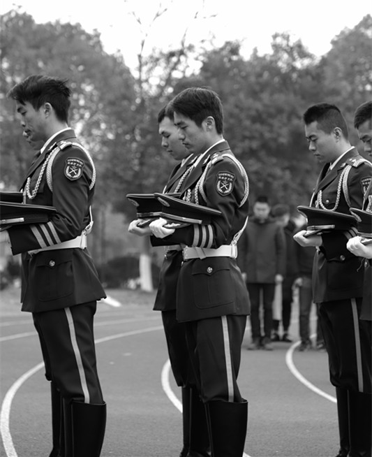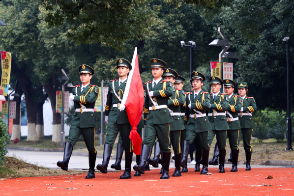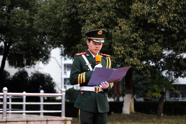 国旗护卫队队长2016级市场营销专业王树朋作为学生代表在发言中分享他的参军经历,并表示作为一名退伍军人、一名大学生,要牢记历史奋发图强,主动担负建设现代化强国的重任。
