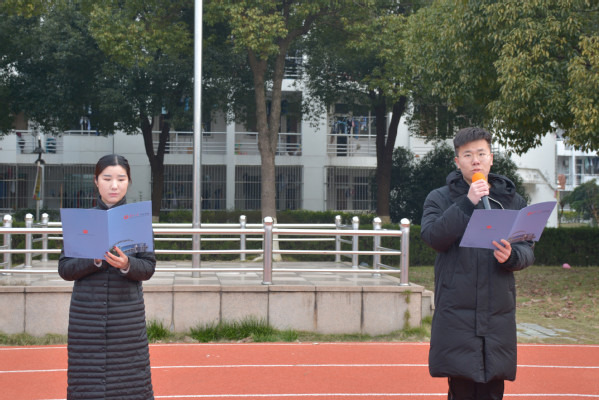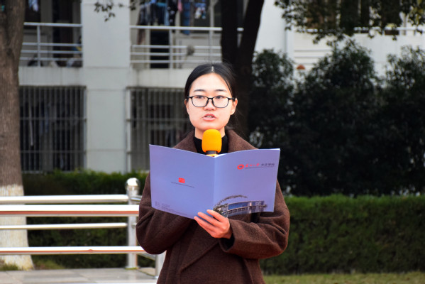 2017级播音与主持艺术专业邵洁玉和2018级播音与主持艺术专业徐培健宣读《和平宣言》,并带领全场同学进行庄严宣誓。