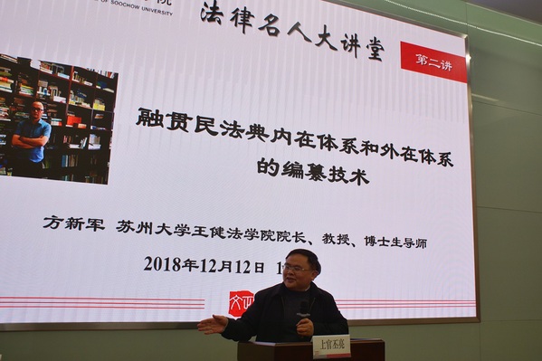 12月12日晚,由我院法政系主办的“法律名人大讲堂”第二讲在教学楼3-101成功举办。本次大讲堂邀请了苏州大学王健法学院院长、教授、博士生导师方新军作主讲嘉宾,讲座主题为“融贯民法典内在体系和外在体系的编纂技术”。我院法政系主任上官丕亮、团学指导老师吉顺权出席了大讲堂,大讲堂由上官丕亮主持。