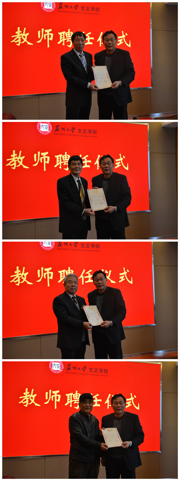 施盛威宣读聘任文件,对本次聘任的四位专家学者表示热烈欢迎和衷心感谢。这四位老师一直以双聘教师的身份投身于文正教学事业,其中三位分别承担我院文学与传播系、光电与能源工程系、艺术系的系主任岗位工作。三个系在几位主任的带领下,系科工作特色初步形成,人才培养特色逐步彰显,在专业内涵建设、师资队伍建设、学生培养、教改科研等工作上取得了一定成绩。