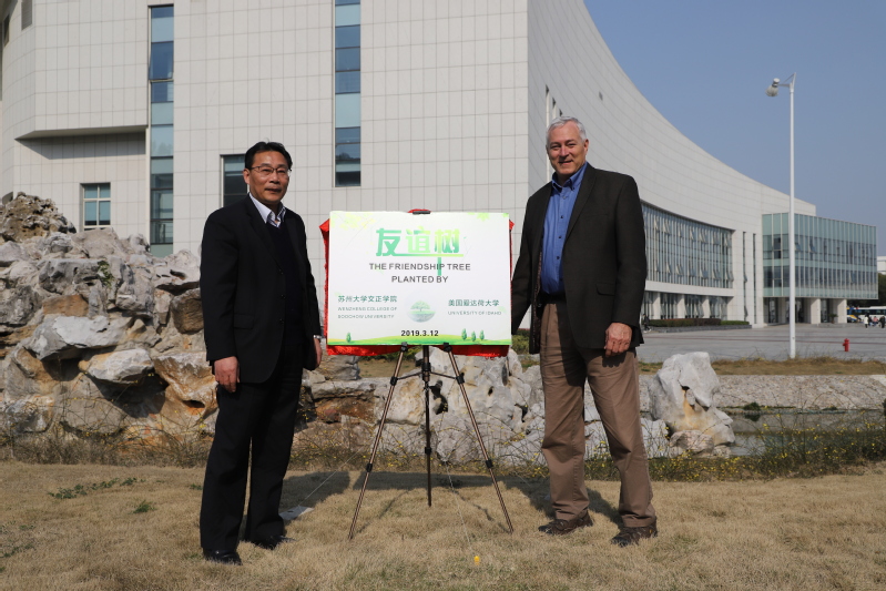当天正值植树节,吴昌政与Larry两位院长分别代表各自学校在综合楼西侧共同栽种了五针松,象征两校友谊地久天长。