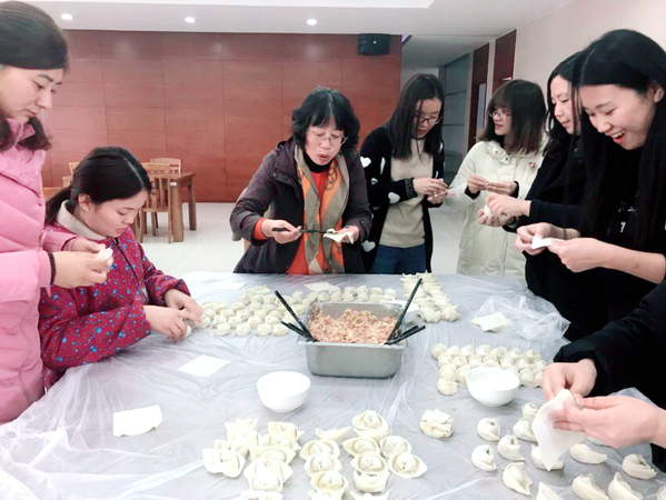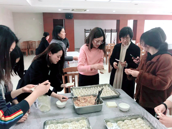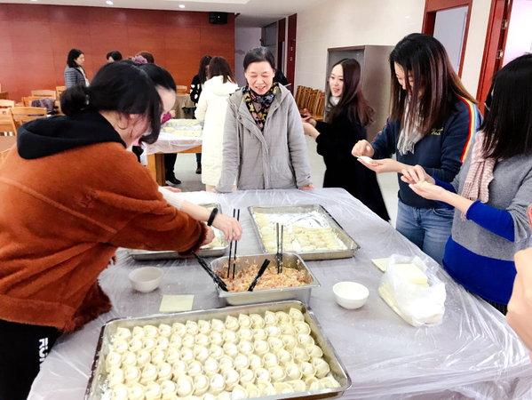 当天下午,学院女职工在教工餐厅参与了现场活动。大家有说有笑,手中的筷子上下翻动,仅一个小时,就裹了近千只馄饨。大家互相切磋技艺,传授经验,其乐融融。