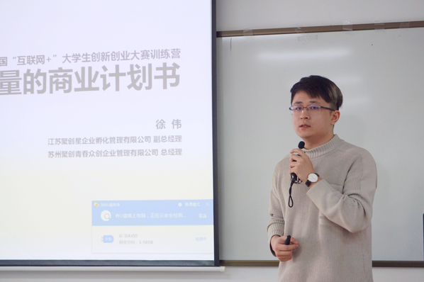 接着,徐伟以“如何打造高质量商业计划书”为主题,开展本届提高班第一期讲座。他详细分析了商业策划书的内容构成,围绕市场与竞争分析、总体战略目标与规划、财务与风险机遇分析等方面展开演讲。徐伟指出商业计划书就是创业团队的第一张脸,商业策划书决定了评委或投资方对创业项目的第一印象。徐伟提醒同学们,在设计商业计划书时,应基于“五个依据”“两个便于”以及“一大特色”来进行,才能设计出一个能够充分体现创业项目特色以及商业价值的计划书。
