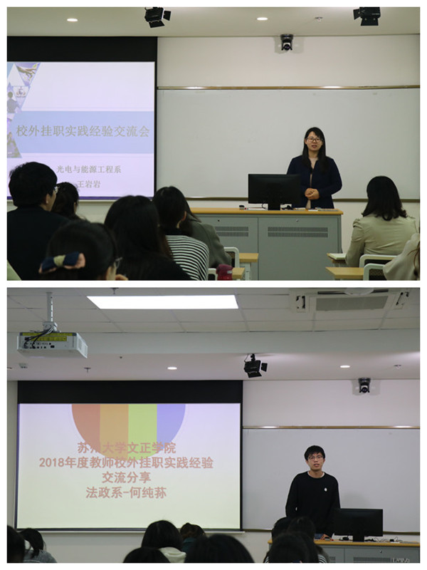 光电与能源工程系王岩岩、法政系何纯荪两位老师分别就自己本次挂职实践情况作了汇报。王岩岩着重介绍了她作为软件工程师在苏州华电的工作情况,指出了挂职实践需要“带着‘目的’去,带着‘成果’回”。何纯荪在实践期间主要从事人力资源管理相关的岗位工作,协助实践单位修订劳动合同、完善职工花名册等,结合个人经历,他总结了挂职实践在教师个人职业生涯发展、“双师型教师”培养以及课堂“教以治学”等方面的必要性。