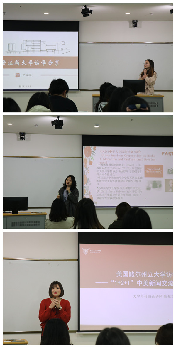 轨道交通工程系严荣慧、工商管理系万菲以及文学与传播系钱毓蓓三位老师向与会老师们分享了自己在海外学校的研修经历。严荣慧作为美国爱达荷大学电气与计算机工程系的一名助教,通过观摩课堂教学、指导实验及课程设计、参与课外实践活动等方式系统地了解了美方电气工程专业本科生培养方式。万菲在鲍尔州立大学的弥勒商学院开展研修,她通过听课、访谈等方式,对比分析了美方任课教师的教学特点和学生学习特点;通过问卷调查,对中方留学生在基本情况、生活适应情况、学习适应情况、文化融入性四个方面进行调研,获得有效数据和结论。钱毓蓓体验了鲍尔州立大学新闻专业一学期的教学活动,深度参与合作教师们的课堂教学与课后辅导,掌握了相关课程的教学内容及教学方法,了解了新闻专业学生社团的现状和运作,并在此基础上对我院相应课程教学提出合理化建议,比如:加强英语学习,提高托福通过率;增设双语课程,了解美国社会文化;提供实践机会,尽早熟悉专业设备。