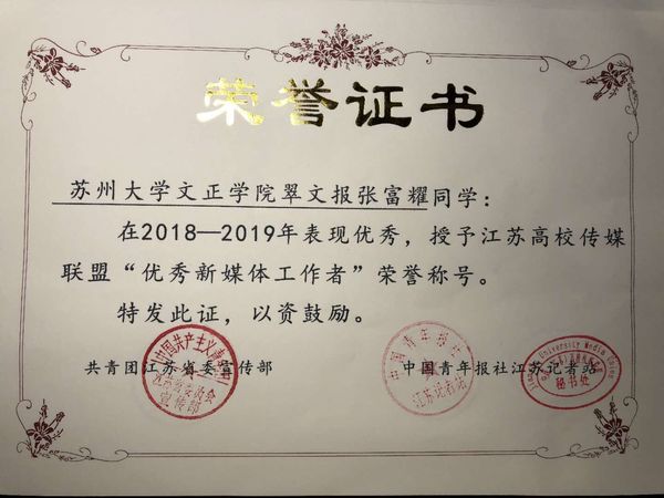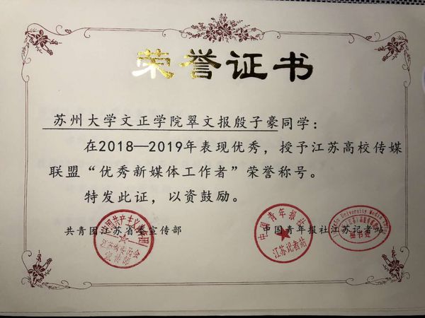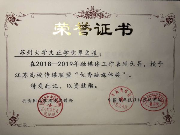 近日,中国(江苏)高校传媒联盟2019年年会于东南大学举行。我院学生新闻中心下属的翠文报荣获2018—2019年度中国(江苏)高校传媒联盟“优秀融媒体奖”,中心同学殷子豪与张富耀荣获“优秀新媒体工作者”称号,2015级汉语言专业董翔的新闻作品《被时代撕裂的印刷人生》荣获“校媒十佳新闻作品奖”。以上奖项由共青团江苏省委宣传部、中国青年报江苏记者站以及中国(江苏)高校传媒联盟共同评选而出。据统计,此次也是我院继2016年后再次获得该联盟的奖项。