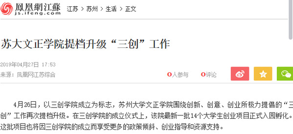 4月26日,以三创学院成立为标志,苏州大学文正学院围绕创新、创意、创业所极力提倡的“三创”工作再次提档升级。在三创学院的成立仪式上,该院最新一批14个大学生创业项目正式入园孵化。这批项目也将因三创学院的成立而享受更多的政策倾斜、创业指导和资源支持。