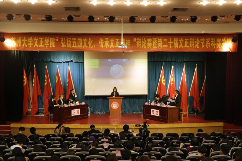 5月7日晚,由我院团委及社团联合会联合主办、文正辩论社承办的 “弘扬五四文化,传承文正精神”辩论赛暨第二十届文正辩论节系科赛决赛在我院学术报告厅举行。我院院长助理、学生工作部部长(兼)卞海勇,学生处副处长孙兰镇以及学生处相关老师出席活动。苏州大学传媒学院讲师、苏州大学辩论队教练穆杨,苏州大学机电学院辩论队教练、原文正辩论社社长、13级优秀辩手张文琪,苏州大学校辩论队队长、16级优秀辩手郭苏横受邀担任决赛评委嘉宾。