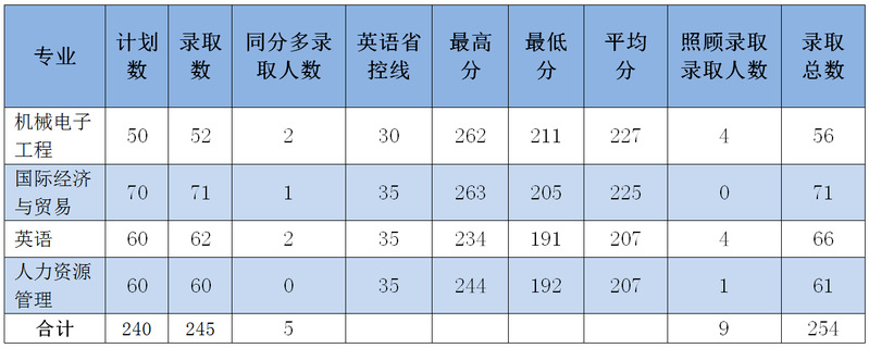 此前,我院于4月21日按照省教育厅统一要求严格组织了2019年五年一贯制专转本招生考试工作,共有1144名考生参加了考试。经阅卷评分与资格审核,我院共录取五年一贯制专转本考生254名。其中:机械电子工程专业录取56人,录取分数线211分;国际经济贸易专业录取71人,录取分数线205分;英语专业录取66人,录取分数线191分;人力资源管理专业录取61人,录取分数线192分。