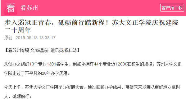 从创办之初的13个专业1301名学生,到如今拥有44个专业近12000在校生的规模,苏州大学文正学院走过了不平凡的20年办学历程。