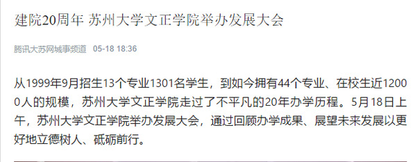 从1999年9月招生13个专业1301名学生,到如今拥有44个专业、在校生近12000人的规模,苏州大学文正学院走过了不平凡的20年办学历程。5月18日上午,苏州大学文正学院举办发展大会,通过回顾办学成果、展望未来发展以更好地立德树人、砥砺前行。