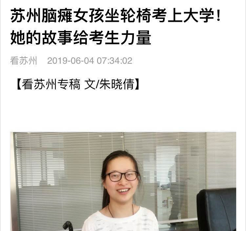 但你很难想象,这个爱笑的女孩因为脑瘫,从小就需要依靠轮椅生活。你也许更难想象,她凭借着自己的努力考上了重点高中,去年又考取苏大文正学院,如今即将升入大二。
