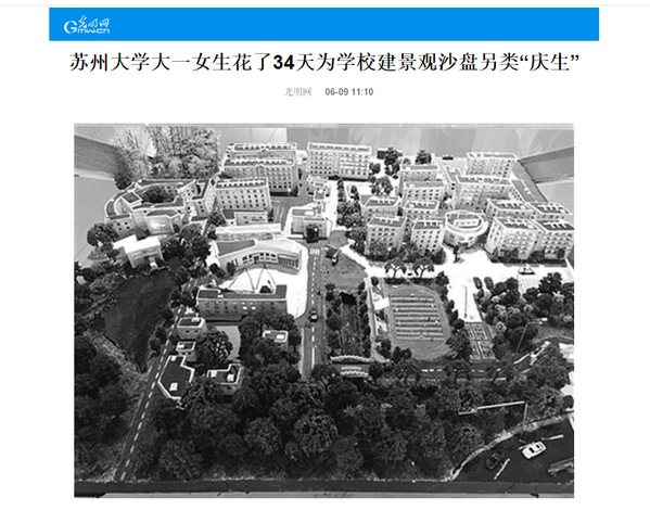 波光粼粼的水面,绿意盎然的树林,整齐划一的校舍……一个漂亮的校园景观沙盘,展现在众人面前。这是苏州大学文正学院大一女生胡美琪耗时34天制作完成,献给学校的生日礼物。