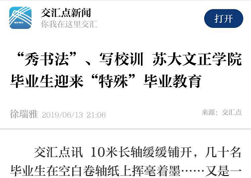 文正学院校名“文正”,取自先贤范仲淹的谥号“范文正公”,并在今年将校训正式定为“文者文章,正者道德”,期望学生不仅要有“美好文章”,还要“端正品德”,勇担时代重任。“书法艺术是中华民族的瑰宝,我们也希望借此更好地提倡大学生重视传承传统文化。”文正学院院长吴昌政表示,让毕业生书写校训,仪式感十足,可以让他们更加深刻地理解和铭记校训,并在毕业之后继续弘扬校训精神。