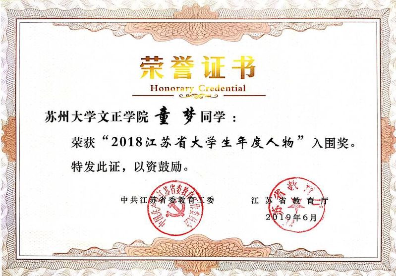童梦荣获2018江苏省大学生年度人物入围奖