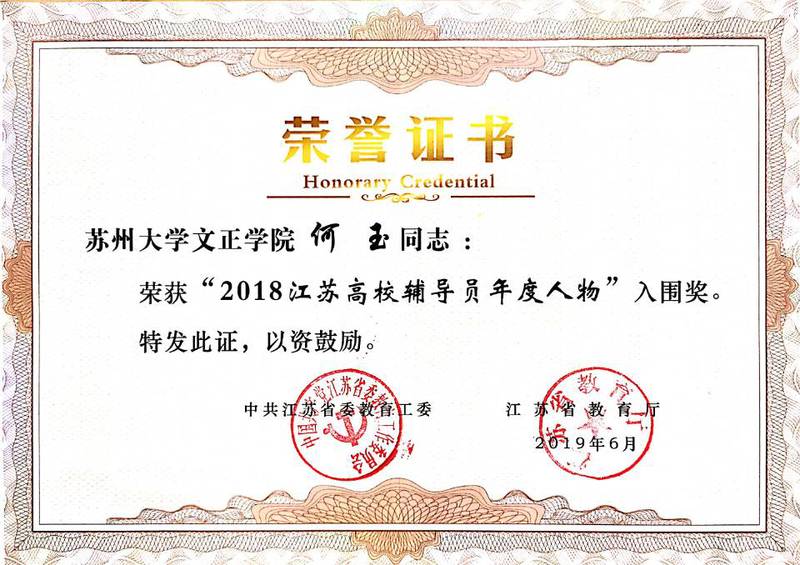 何玉荣获2018江苏高校辅导员年度人物入围奖