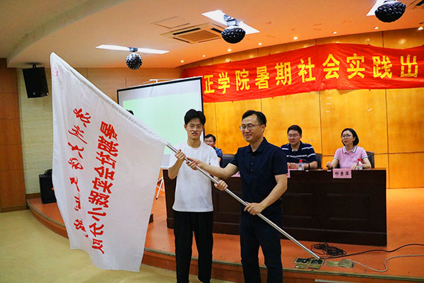 在与会人员的掌声中,卞海勇为暑期社会实践学生代表李筠辉授旗,2019年暑期社会实践正式拉开帷幕。据悉,今年学院共有8200余人次参与暑期社会实践活动,其中围绕理论普及宣讲、依法治国实践、科技支农帮扶、海外教育研修等九大方面组建82支暑期社会实践团队,暑期各支团队将奔赴世界各地根据实践主题开展活动,在实践中探求真知,为新时代、强国梦贡献自己的青春力量。