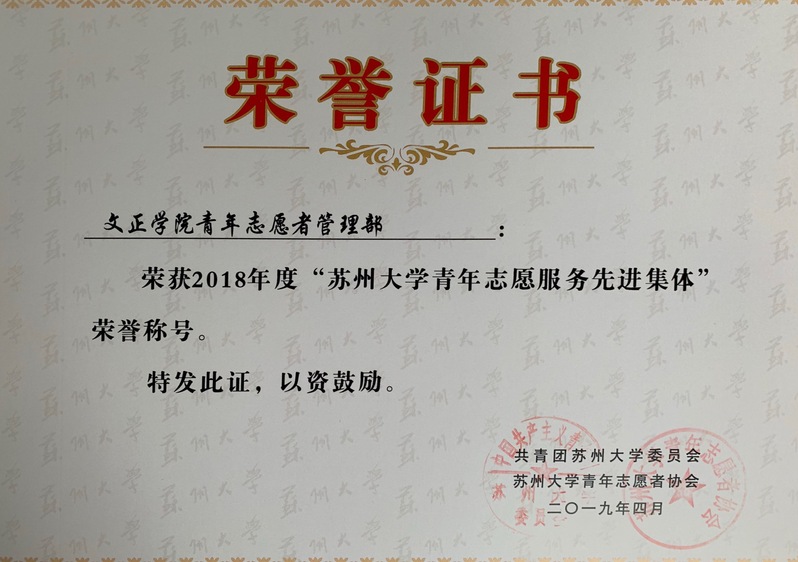 我院团委坚持特色项目,打造文正品牌,传承苏大百年“惠寒”精神,连续八年开展“爱·黔行”贵州支教,不断扩大支教数量和范围,形成文正支教团。全年学院参与公益活动超4000人次,累计时长3.7万小时,全年累计献血量27万毫升,打破苏州血站2018年单日献血人次和血量记录。我院“越溪小学短期支教”项目荣获苏州大学第三届志愿服务项目优秀奖称号,团委青年志愿者管理部荣获苏州大学青年志愿服务先进集体荣誉称号,团委荣获苏州大学“无偿献血先进单位”称号。