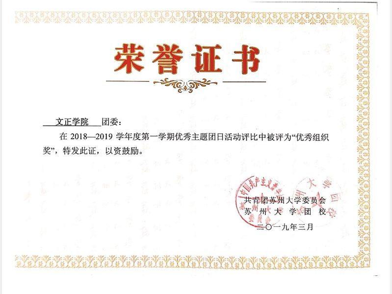 我院团委坚持中心工作,完善思想育人,在传统主题团日活动开展基础上,以“信仰公开课”为契机,全年共开展主题教育活动376场,覆盖全院1-3年级150余个团支部;打造“国旗下的教育”系列公开课,利用仪式教育、营造庄严氛围,以“一月一主题”开展坚定青年理想信念教育的主题活动,得到多家媒体同步直播和报道,示范效应良好;承办省级示范公开课,以传统文化体验、拜师礼等形式,使团员青年主动传承中华文化,在校园内营造尊师重道的良好氛围。其中2017级汉语国际教育团支部“从师解惑·勤勉求道”主题团日活动荣获苏州大学“十佳主题团日活动”称号,2017级汉语言团支部“改革开放四十年,共同筑梦新时代”主题团日活动荣获苏州大学“优秀主题团日活动”称号,我院团委获评苏州大学主题团日活动“优秀组织奖”称号。