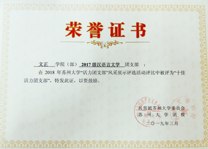 2017级汉语言文学团支部获评苏州大学“十佳活力团支部”称号
