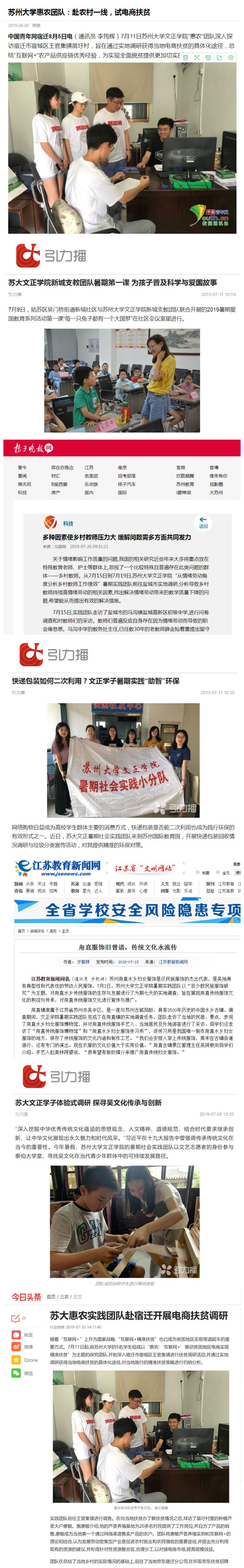 目前,我院“惠农”实践团队,“围绕中心、服务大局,开展普法主题实践活动”实践团队,“秦伯大学堂实践团”实践团队以及“爱·黔行”贵州支教实践团队等受到了人民网、中国网、苏州日报、宿迁日报、苏州交汇点、苏州引力播等媒体的报道近30篇,获得了较好的社会评价。