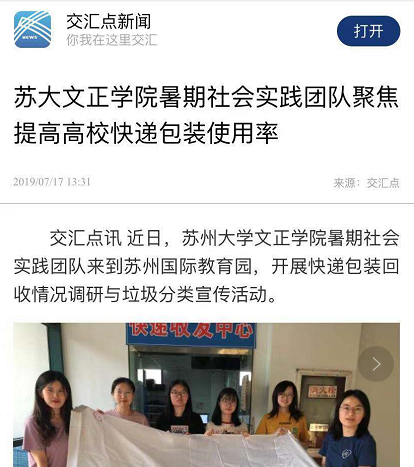 近日,苏州大学文正学院暑期社会实践团队来到苏州国际教育园,开展快递包装回收情况调研与垃圾分类宣传活动。
