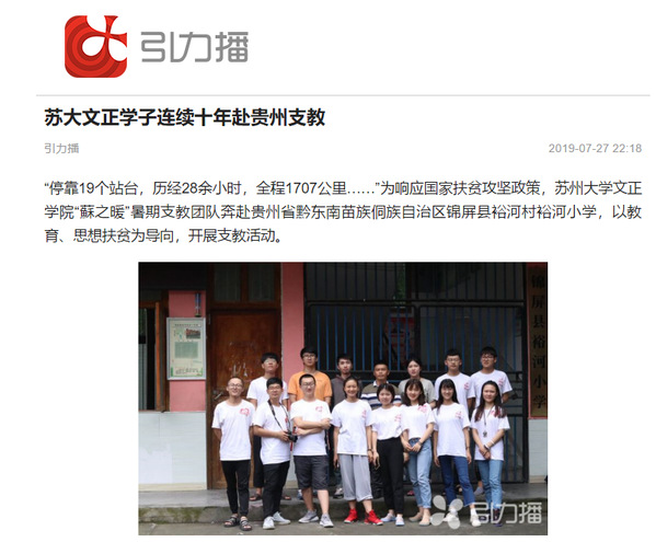 “停靠19个站台,历经28余小时,全程1707公里……”为响应国家扶贫攻坚政策,苏州大学文正学院“蘇之暖”暑期支教团队奔赴贵州省黔东南苗族侗族自治区锦屏县裕河村裕河小学,以教育、思想扶贫为导向,开展支教活动。