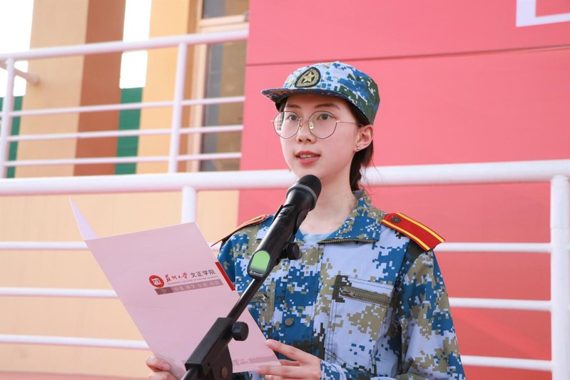来自34连4排4班的王梓源代表全体参训学生发言。她号召同学们要发扬“特别能吃苦,特别能忍耐,特别能战斗”的精神,以优异的军训成绩献礼新中国成立70周年。