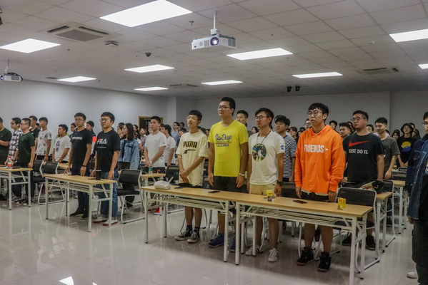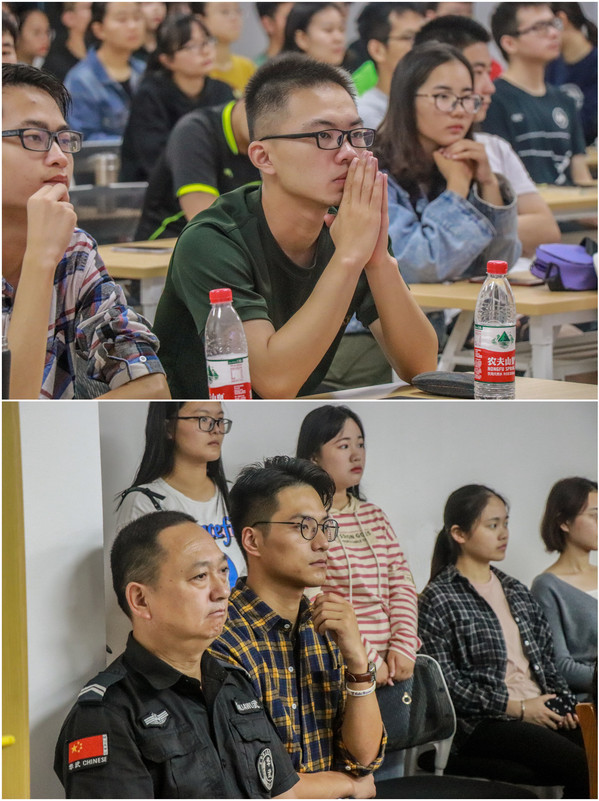 上午9时,各系学生骨干代表、普通学生代表,部分退伍复学以及志愿参军的学生代表以及教师代表陆续走进教室。虽然天降大雨,但丝毫没有影响同学们的热情,到场学生人数远远超出了教室的容量,部分学生选择站在教室后面或者教室门口观看。