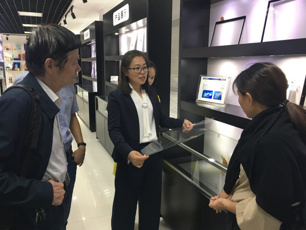 下午1点30分,参观交流团队抵达苏大维格集团总部。在苏大维格集团副总裁周小红女士的引导下,团队首先前往企业的“科技文化展厅”进行参观。参观期间,周总详细地讲解了集团自主研发的多项技术及产品,主要包括:柔性传感技术、透明电磁屏蔽膜、超级智能终端、裸眼3D显示技术以及应用空间光调制(SLM)和位相调制(PLM)技术实现的高端微纳直写设备等。