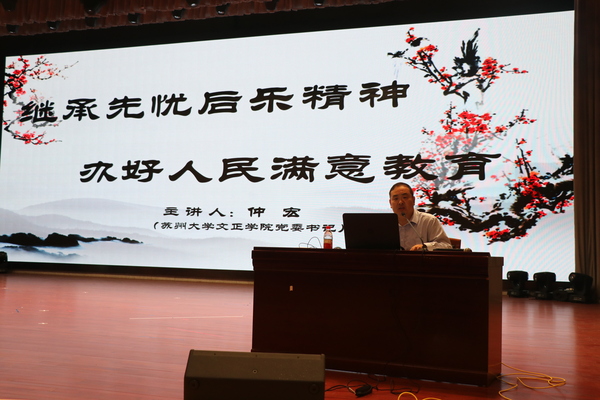 党委书记仲宏以“继承先忧后乐精神,办好人民满意教育”为主题,从院名由来、范仲淹人生轨迹和历史贡献、史料陈列馆藏品赏析、范公精神的启示和努力方向几个方面进行了讲解。院长吴昌政以“提高政治意识、严守政治规矩、坚强党的组织建设”为主题,副院长朱跃从认识体会、基本态度、初心使命、检视问题以及思路举措五个方面,纪委书记解燕以“立德树人的时代内涵与实施路径”为主题,党委副书记、副院长袁昌兵以“当代大学生的使命与担当”为主题,共同为全院广大师生党员上了一堂生动、深刻、精彩的专题党课。