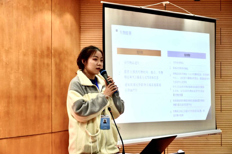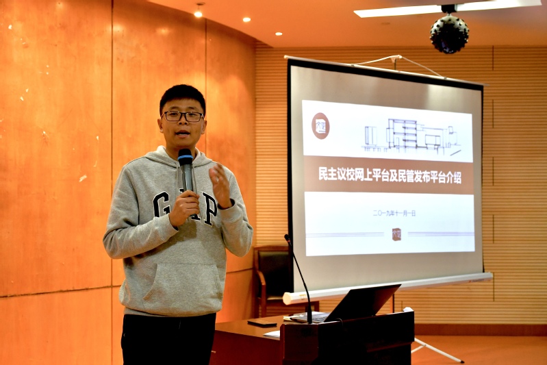 学生会民主管理委员会王瑞雪同学从一个中心、二个功能、三个平台、四大抓手等四个方面介绍了学生民主管理工作整体情况,并从三级工作体系、日常工作、民管联络员工作职责、平台建设等四个方面详细介绍了学生民主管理工作现状。
