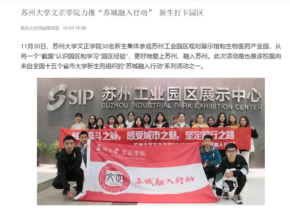 11月30日,苏州大学文正学院30名新生集体参观苏州工业园区规划展示馆和生物医药产业园,从另一个“截面”认识园区和学习“园区经验”,更好地爱上苏州、融入苏州。此次活动是也是该校面向来自全国十五个省市大学新生而组织的“苏城融入行动”系列活动之一。