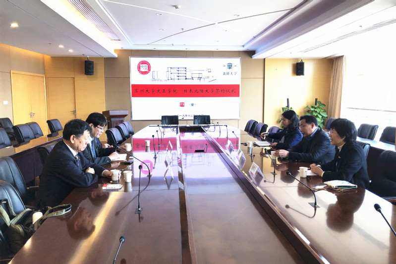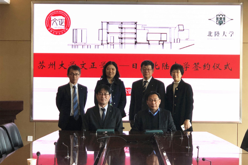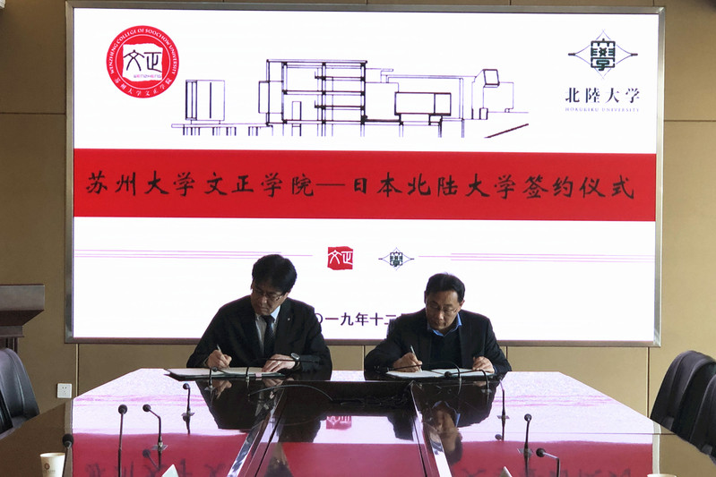 会谈结束后举行了苏州大学文正学院和日本北陆大学友好交流合作协议的签约仪式,吴昌政和小仓勤分别代表两校签署了协议。