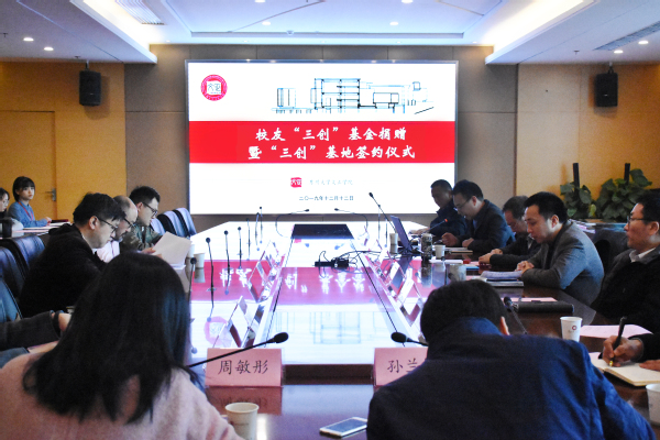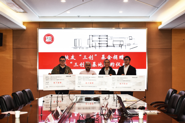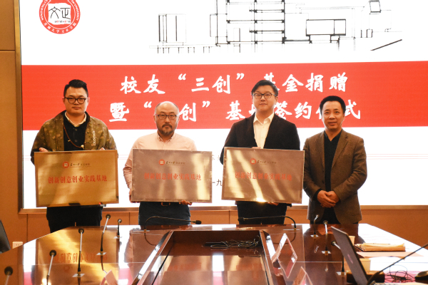 接着,在与会嘉宾的见证下,三位校友企业代表与基金会副秘书长、党委办公室副主任陈波签订并交换捐赠协议,袁昌兵为三家校友企业进行创新创意创业基地授牌。