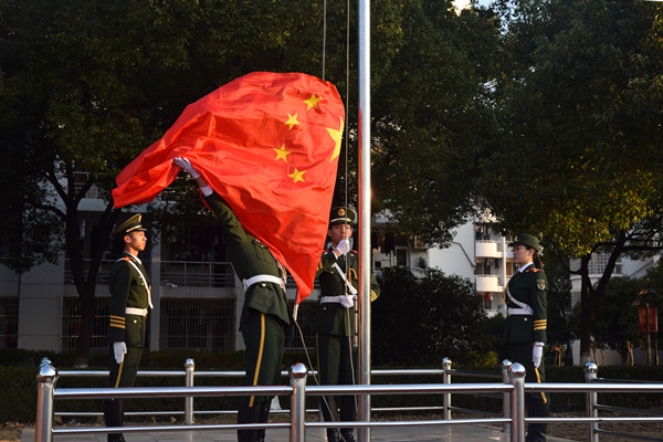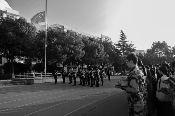 上午7:30,国旗护卫队动作整齐、口号嘹亮走向旗杆。伴随着高亢的国歌声,五星红旗缓缓升起,为纪念在南京大屠杀中遇难的同胞和革命先烈,降半旗并默哀一分钟。