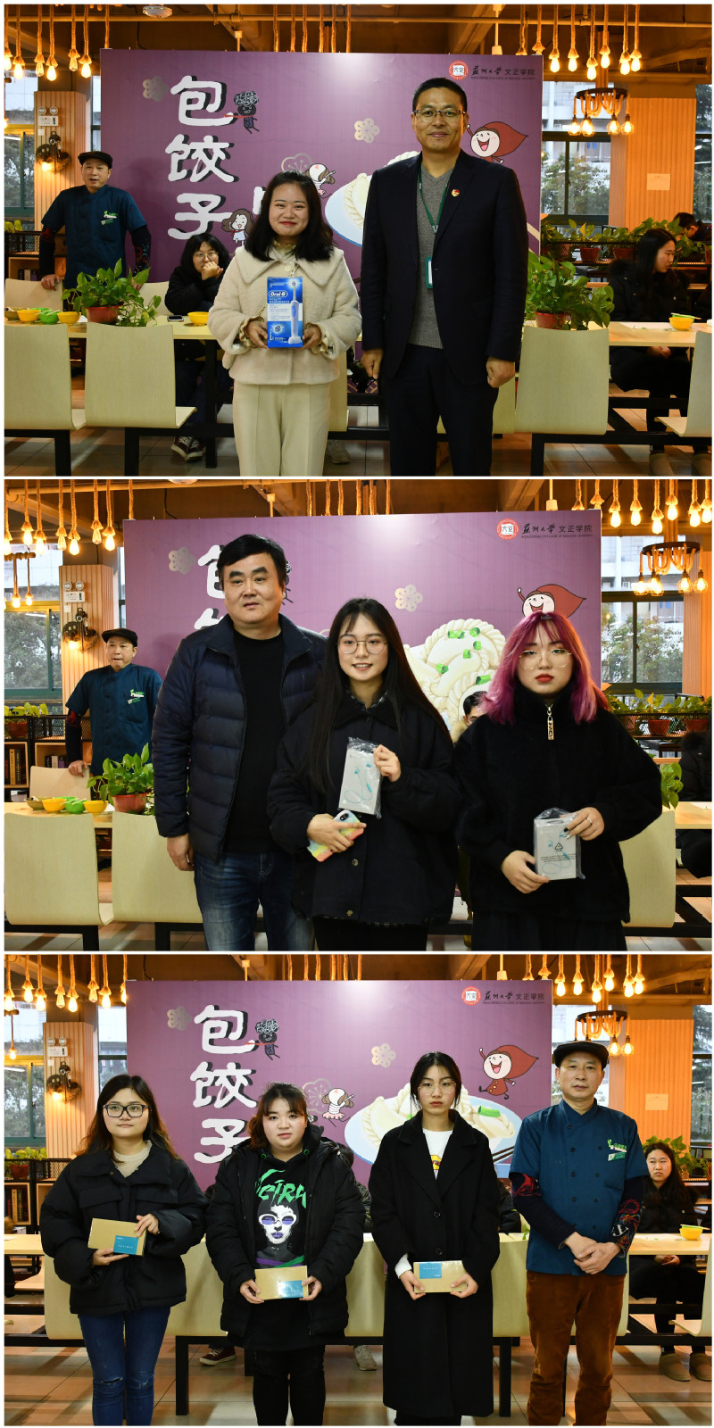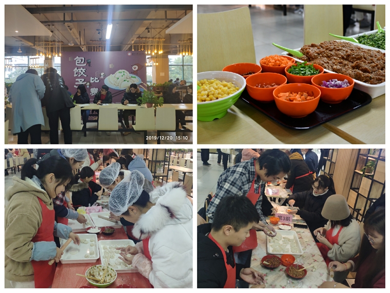 当天下午,三食堂二楼洋溢着浓浓的节日氛围,包饺子大赛如期举行。通过前期的宣传和报名,48名选手分成12组进行最终角逐。比赛开始前,三食堂的王师傅面授经验,教同学们如何擀饺子皮、如何包出好看的饺子,桌边围满同学。比赛开始,选手们自己擀皮、包馅、捏饺子、调料,一边包饺子一边唠家常,餐厅里回荡着欢声笑语。专业评委和大众评委从速度、外观、口感等几个方面进行打分,最终2018级机械工程班的陆怡佳、史晶晶、韩宵、蒋巧四位同学获得一等奖。