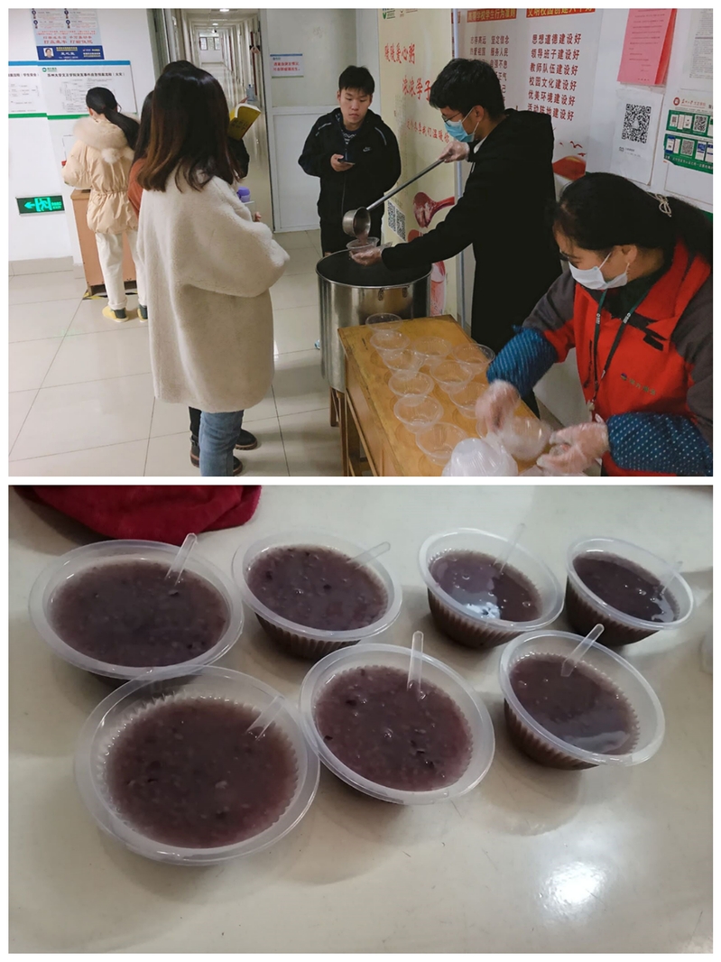 本次冬至系列活动除免费加餐行动,还有暖心粥计划、火眼金睛行动、包饺子大赛等活动。12月16日至12月19日下午,暖心粥计划在各宿舍楼下开展,活动期间,同学们到指定宿舍楼一楼服务台可以免费领取暖心粥一份,给寒冷的冬天增加了一些温暖,让同学们感受到浓浓的温情。