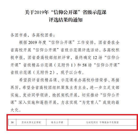 近日,团省委高校部发布《关于2019年“信仰公开课”省级示范课评选结果的通知》,经过团省委高校部组织的评审,我院以“与时代同行,不辱使命不负期望”为主题的“青马公开课”成功申报为“信仰公开课”省级示范课。