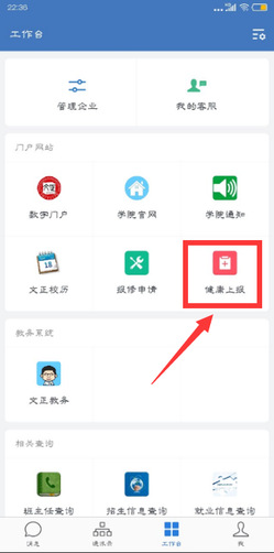 3.进入“工作台”后,可见“健康上报”,点击“健康上报”进行线上填写。“学生基本信息上报”只需填写一次,“学生每日健康上报”需每天填写。填写完毕后点击“提交”即可。