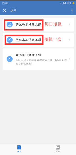 注意:“学生基本信息上报”只需填写一次,“学生每日健康上报”需每天填写。
