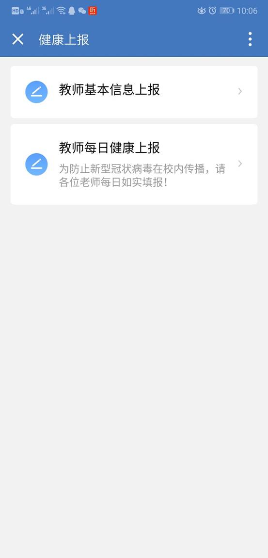 二、填报时间:自2月10日起,全体教职工每日中午12点前通过“企业微信”如实填报个人信息。注意:“教职工基本信息上报”只需填写一次,“教职工每日健康上报”需每天填写。