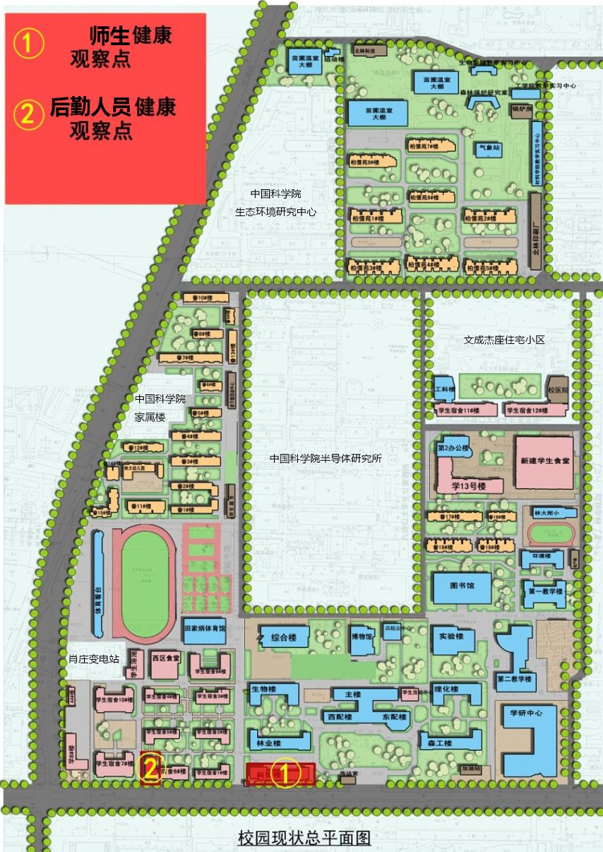 按教育部、北京市有关防疫的要求,北京林业大学党委第一时间成立防控领导小组,并启动校园安全一级管控,全校进入战时状态,统筹各部门在京的党员干部、一线工作人员,第一时间分别针对师生、后勤员工建设了两个独立的校园隔离健康观察点,并已投入使用。