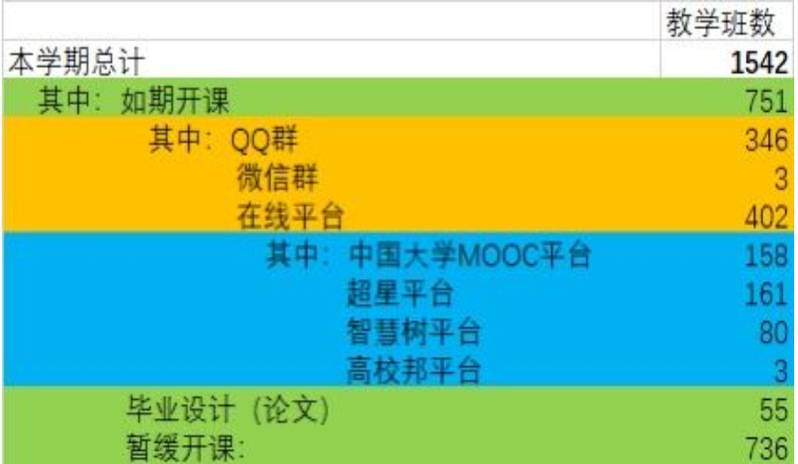 本学期我院共有1542个教学班课程,其中必修课程1057个教学班,选修课程485个教学班, 涉及的班级多,学生数量大,课程负责人更是未雨绸缪,从教学资源准备、平台建课、前期测试、运行管理、学生互动等各个环节都准备充分,保证课程的有序开展。