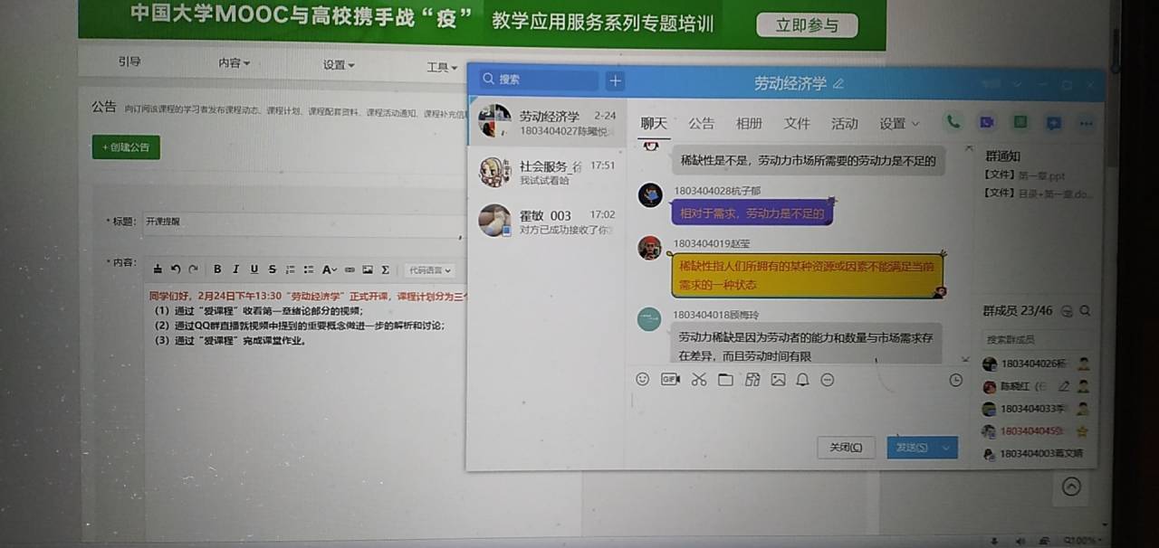 此外在教学工作顺利开展的背后,更少不了、教务处老师的努力和加班加点。还有各位班主任、班长学委传达贯彻了院领导的要求,布置了具体工作任务,确保任课教师和每个学生准时进入网课线上交流群,保证课程的顺利开展。 尽管疫情还没有结束,但“停课不停学”工作在社会服务系所有师生的努力下顺利完成。