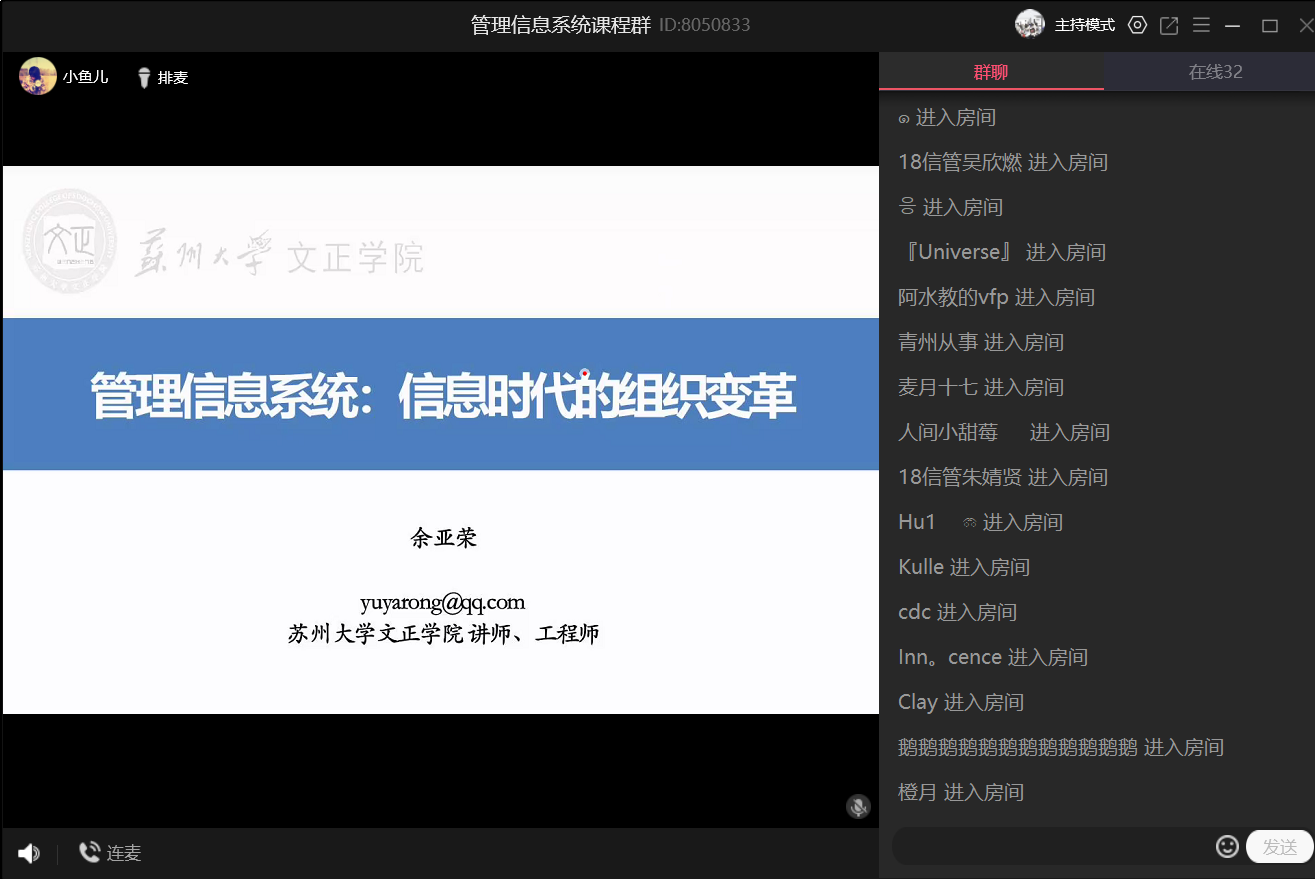 档案专业的余亚荣老师:余老师是社会服务系的青年教师,在本学期有《电子政务》、《电子文件管理》和《管理信息系统》三门课的直播课。在前期准备方面,余老师说周一周二连着两天上课基本感受就是开课前准备的内容多了,既要准备上课的内容,还需要对多个平台有充足的了解,同学们对平台不熟悉,有些因为网络、平台或者自己操作的原因进不来,就需要老师指导他们进入直播间。在上课过程中一旦遇到直播平台有问题,要第一时间更换平台,所以得有预案,比如用QQ群直播,一旦这个平台出现多人不能访问的情况就得赶紧找替换方法,所以余老师还下载了好几个视频会议系统和钉钉备用。