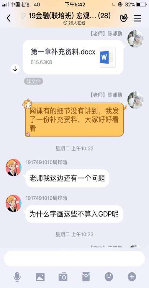 《宏观经济学》课程是经管专业本科生必修的一门专业基础理论课。在周一开课前期,陈老师已经进行了充分的准备工作,包括网课筛选,建好慕课堂等辅助教学工具,同时结合网课资源完善备课工作。周一开课,和学生进行充分沟通,向学生详细说明课程特点、考核要求、教学流程、发布本周学习内容等,使学生掌握充分信息。根据课程特点,陈老师在学生学习过程中设置根据相关知识点设置了讨论题,加强课程互动性。经过学生一章的自主学习后,陈老师还将在下周一的课程中进行QQ直播辅导,对本章内容进行梳理、相关知识点细节补充、疑难问题重点讲解。