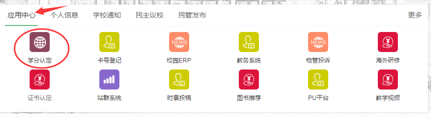 第三步.进入数字门户后点击“应用中心”内的“学分认定”